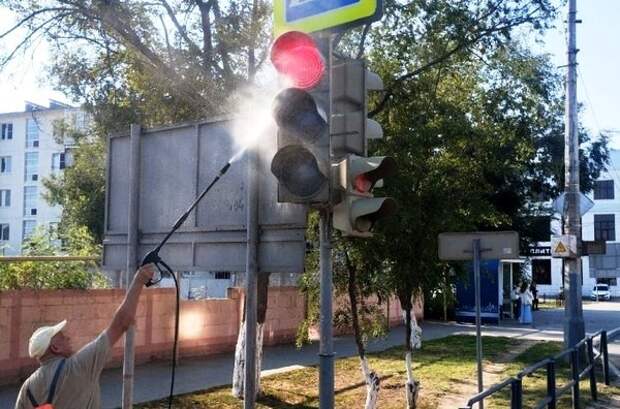 Не оставлены без внимания и сами дорожные указатели. Так, вчера от Аэропортовского шоссе до перекрестка улиц Боевая/Ширяева помыли более полусотни знаков и светофоров.